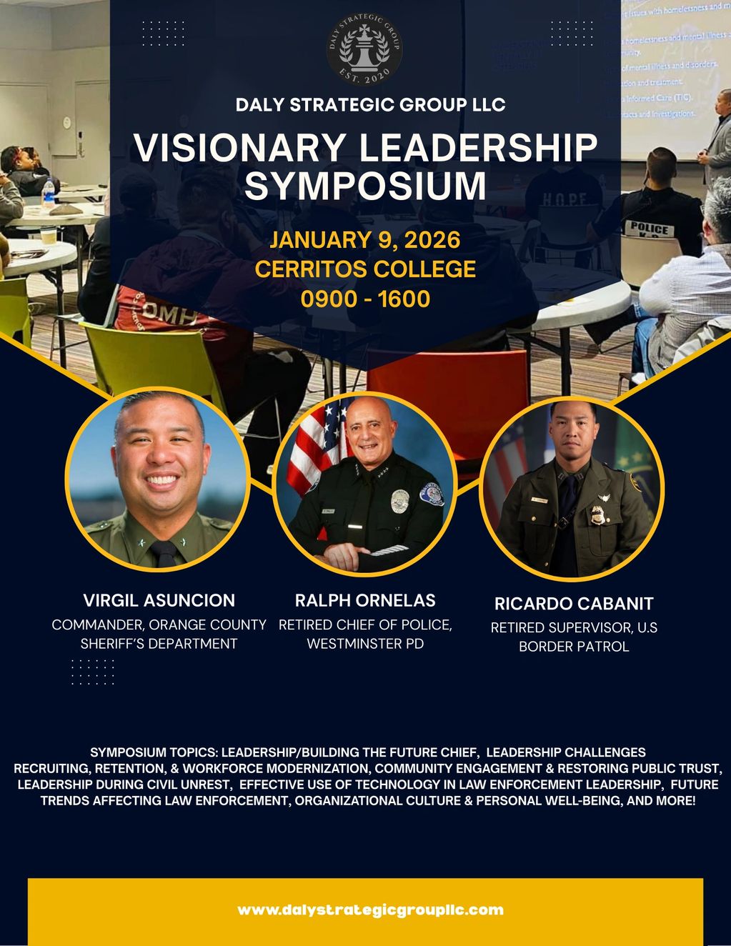 The Visionary Leadership Symposium will focus on cutting-edge leadership strategies for law enforcement. Discussions will cover topics like visionary policing, innovative problem-solving, community engagement, and resilience in leadership roles. The event will feature expert speakers, interactive panels, and networking opportunities for attendees.